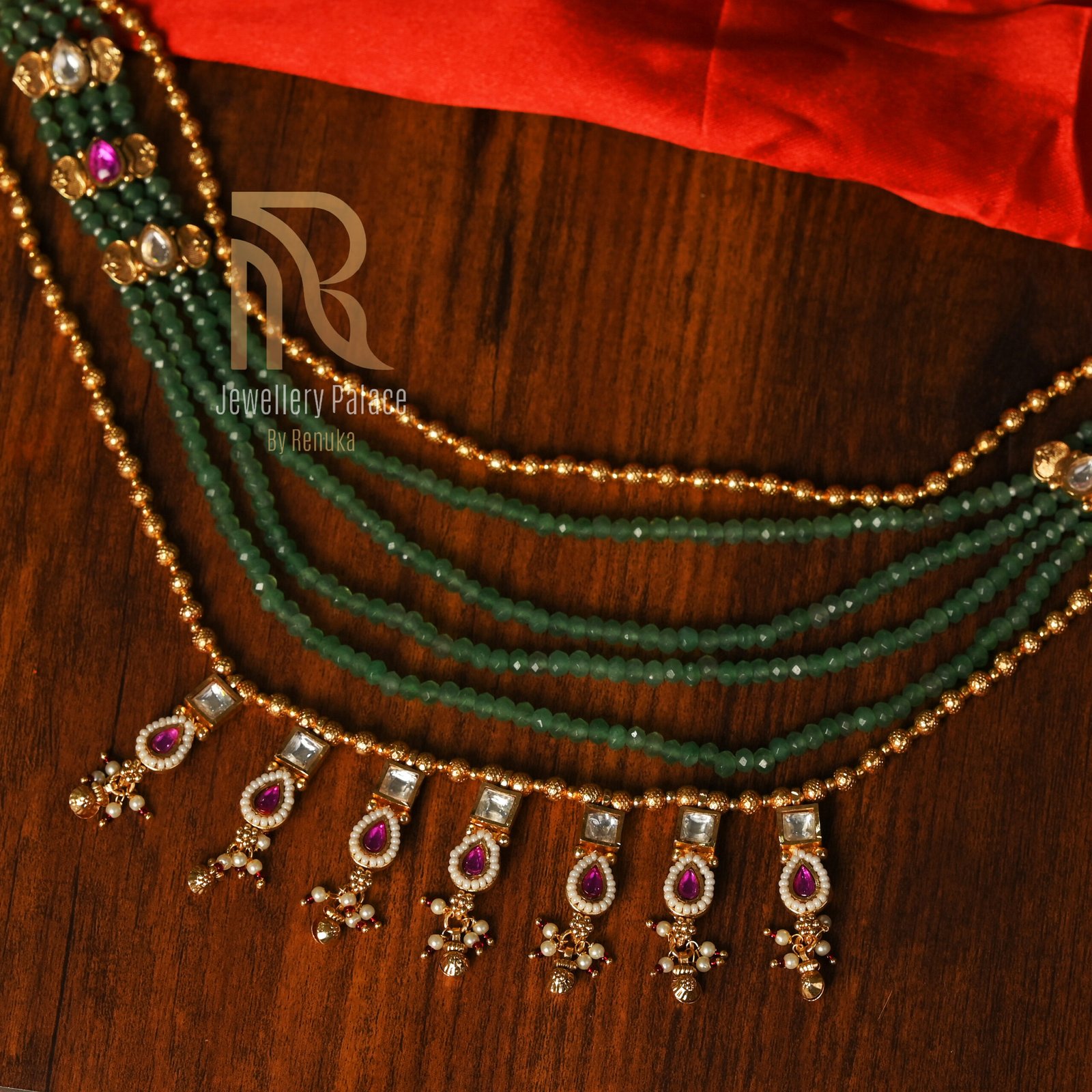 This enchanting necklace combines the richness of emerald-green beads with the brilliance of kundan and ruby accents. Designed with multiple strands of faceted green beads bordered by golden beads, the necklace exudes sophistication and grandeur.