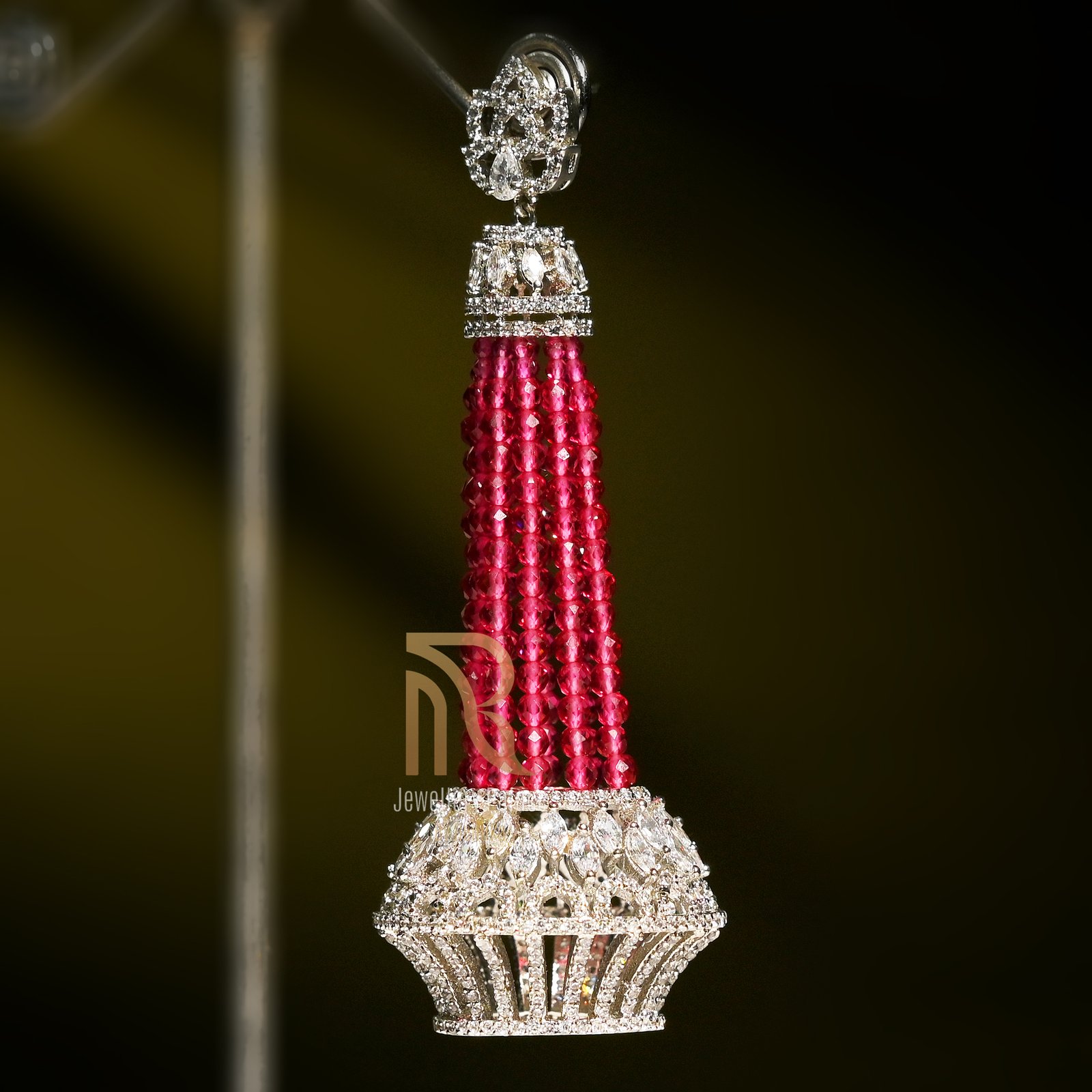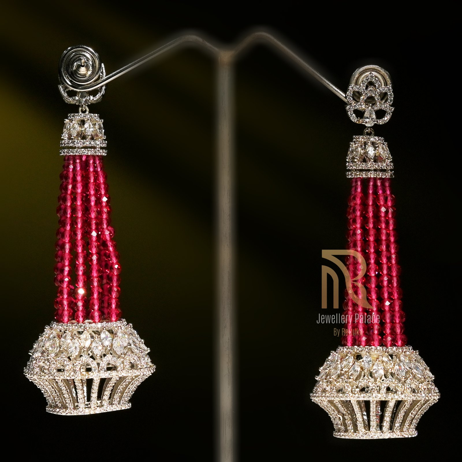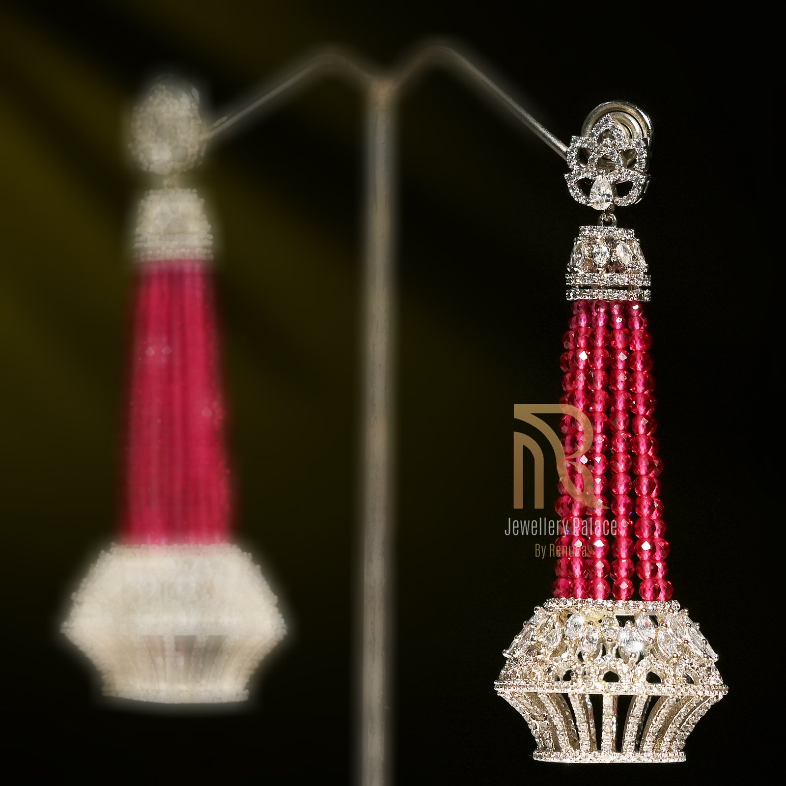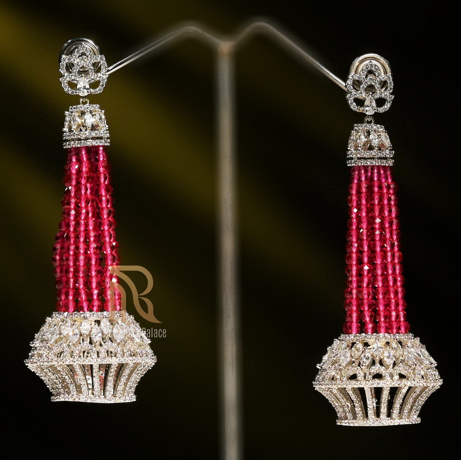Turn heads with these Ruby Tassel & Diamond Crown Earrings, a masterpiece of luxury and elegance. Featuring cascading strands of vivid ruby beads that create a striking tassel effect, these earrings exude vibrance and charm. The tassels are anchored with a magnificent diamond-studded crown-shaped base, intricately designed with brilliant-cut stones that sparkle with every movement.